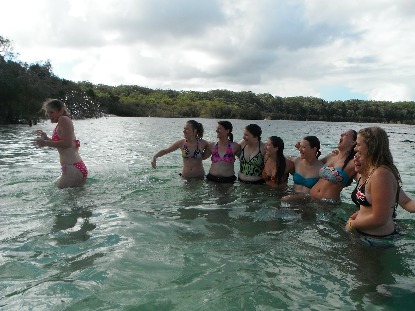 I alla fall, vi stannade för kakor och te, sen tog vi färjan över till världens största sandö. Därefter körde vi på ”Great Sandy Highway” aka stranden (som tydligen faktiskt heter det tidigare officiellt). Speciellt! Efter en stund körde vi in i regnskogen och körde på väldigt skumpiga skogsvägar. Vid ”Central Station” gick vi ur och gick på en liten vandring genom den vackra regnskogen (som växer i sand!) Vi kom ut på andra sidan och därifrån var det inte långt till nästa stopp, sötvattensjön Lake McKenzie! Där var det dags för ett dopp minsann. Solen tittade t.o.m fram när vi var där! Men vattnet var fortfarande kallt.. Efter det var det dags för lunch, vilket innebar barramundi för min del och så sallader till det. Mums!